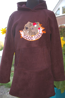hatte ich auf den Rücke von dem kakifarbene T-Shirt von mir gestickt, deshalb habe ich daraus ein Hosenkleid für Lotta geschustert. Beim Zuschneiden hab ich dann die schiefen Flügel wieder etwas geradegerückt. Und mit Kapuze dazwischen fällt das gar nicht mehr auf. Echtes Recycling...