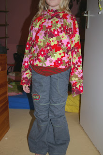für Lotta. Aus leichtem Strukturjeans und dem allerletzten Rest von dem tollen Bizzkids-Stoff. Nachdem ich ja schon gehört hatte, das sie recht weit ausfällt gleich in 110/116 o.NZ und 6 cm verlängert. Und paßt super!!! Im Gegensatz zu der Wanda in 122/128 für Lilli, die ist so riesengroß, trotz auch schon o.NZ, die ist gleich zu ebay gewandert. Der Stoff ist ein toller Strechvelvet, leider kann man den nicht fotografieren. Sie sieht ja mit den Abnähern super aus, kann man aber alles nicht auf dem Foto erkennen.
