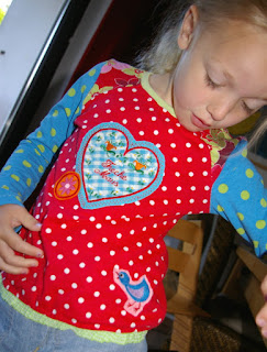 Nachdem Lilli ja diese Feliz verschmäht hatte hat sie aus meinem Schrank den LikeO ausgesucht und eigentlich die kleinen Blümchen in lime von Stenzo, aber da ich mich beim Zuschneiden verschnitten hatte und es dann nicht mehr reichte mußte ich die Pünktchen nehmen. Der Stickie war nicht geordert, aber bei Vögelchen wird sie ja (fast) immer schwacht...