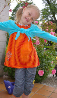 Und heute Morgen ist Lottchen so in den Kiga losgezogen. Die Kerstin aus dem letzten Fitzelchen türkisen Sommerfrottee. Die Ivy mußte nochmal in den Trockner, bei der ersten Anprobe saß sie doch etwas labberig. Jetzt paßt sie perfekt! Das Shirt ist noch vom letzten Sommer.