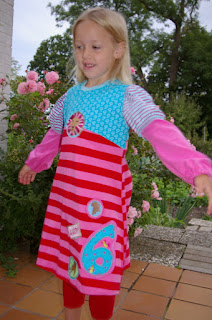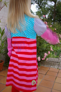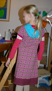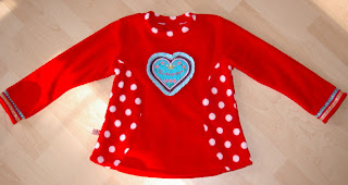 aus beigefarbenem Kuschel-Smoothie von Hilco. Die Unterteile habe ich um 10 cm verlängert und die Punkteärmel waren nicht geplant, aber leider reichte der Stoff nicht mehr für lange Arme :-). Ich LIEBE diesen Stoff, der ist sooo schön.