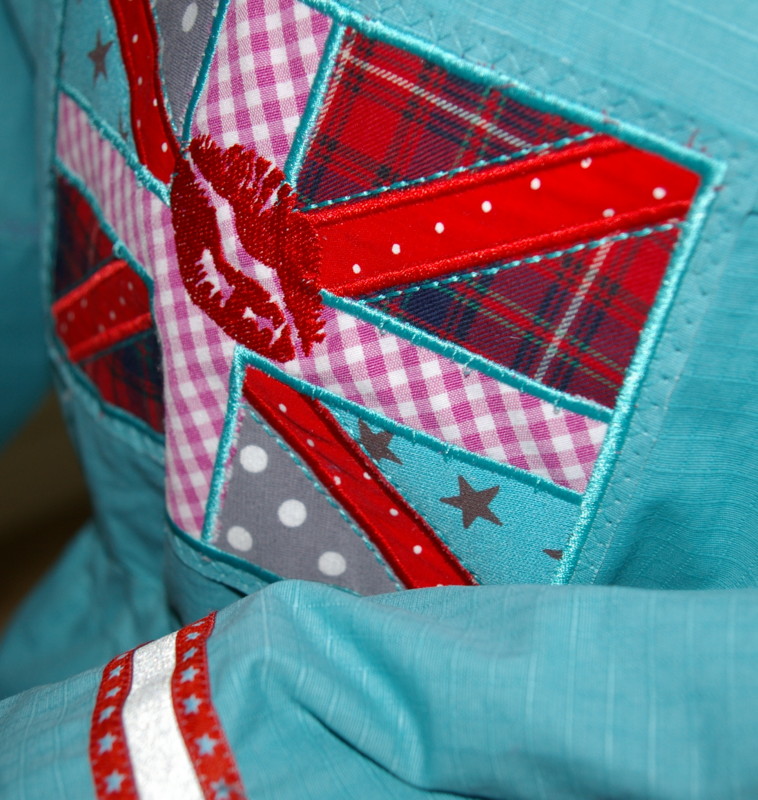 Es mußte unbedingt die Flagge sein! Das Herz und der Schirm sind aus Reflektorgewebe und das orangene Reflektorband hab ich halt mit passenden Sterneband eingefaßt. Die Ärmel sind übrigens gleich lang ;-).