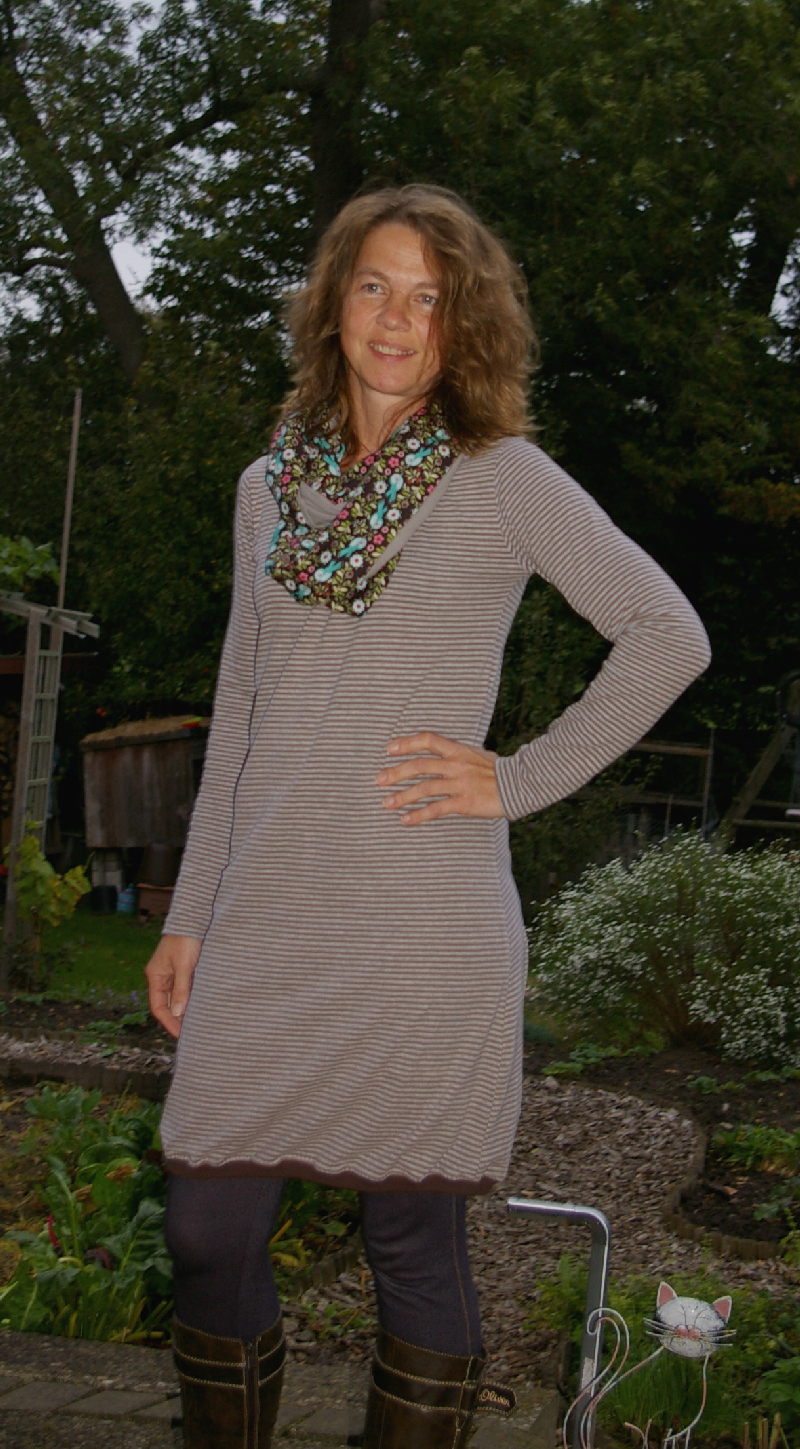 Nr. 1 aus angerautem Jersey in grau-braun von Sanetta mit der Kräuselvariante und tiefem Ausschnitt (sieht man durch den Loop leider gar nicht) und den Saum mit Bündchen gerafft.