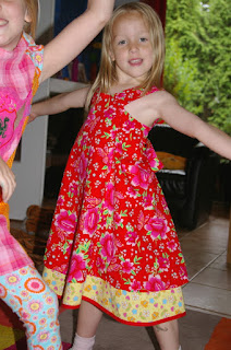 Und jetzt hab ich ein Problem! Ich hab 110/116 o.NZ genäht, geplant für Lotta. Da das kleine Model aber streikte hat Lilli das Kleid probiert (sie hat es mir aus den Händen gerissen *grins*). Und ihr paßt es prima, nur ein Tick zu kurz. Jetzt wollte Lotta natürlich auch. Ihr ist es etwas groß, aber die Länge ist prima. Sie hätten sich fast geprügelt. Na wie gut, das ich mehr davon nähen will :-)). Aber wer bekommt jetzt das???